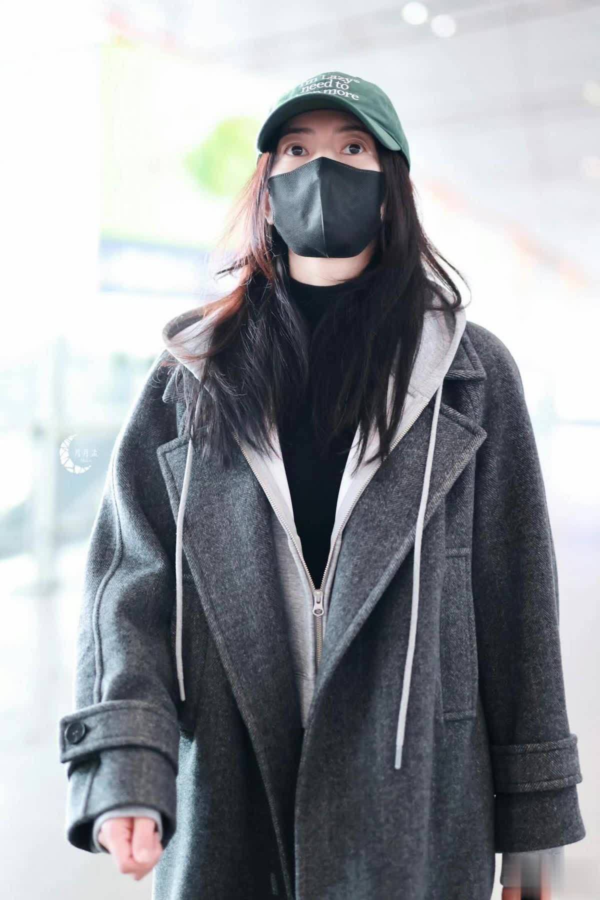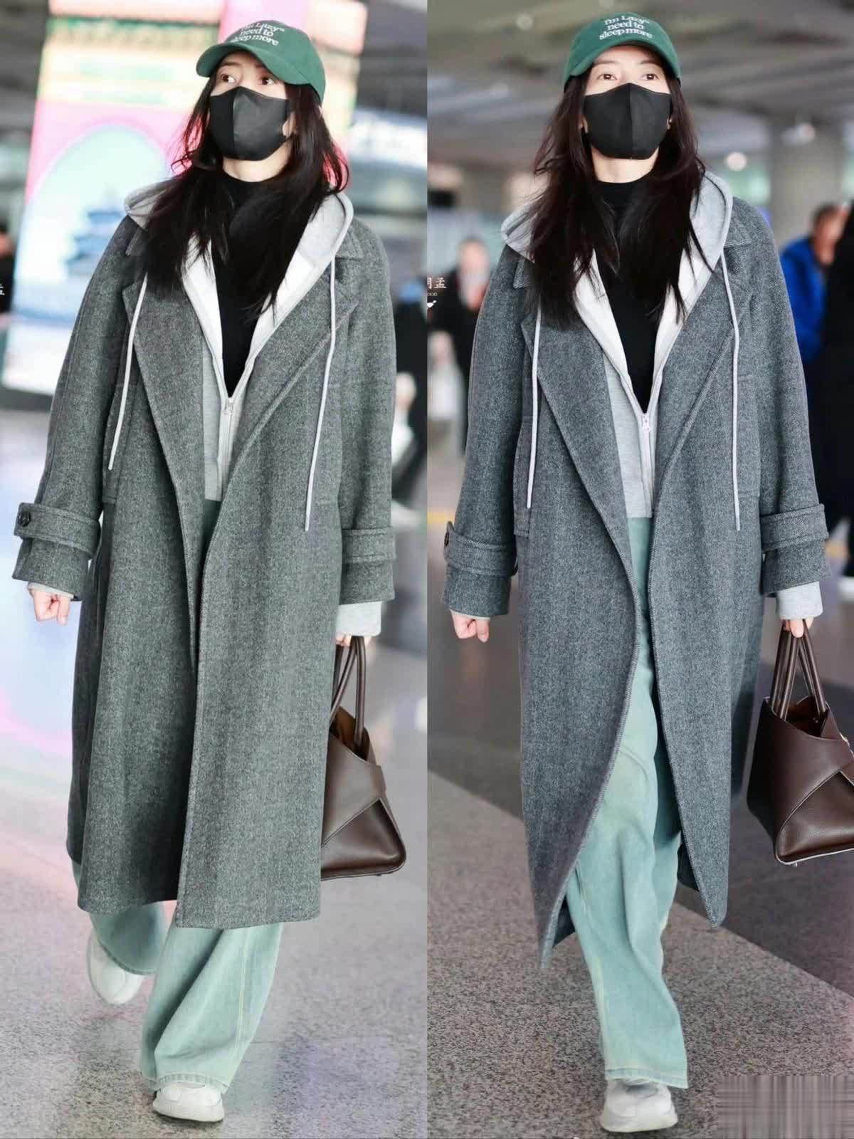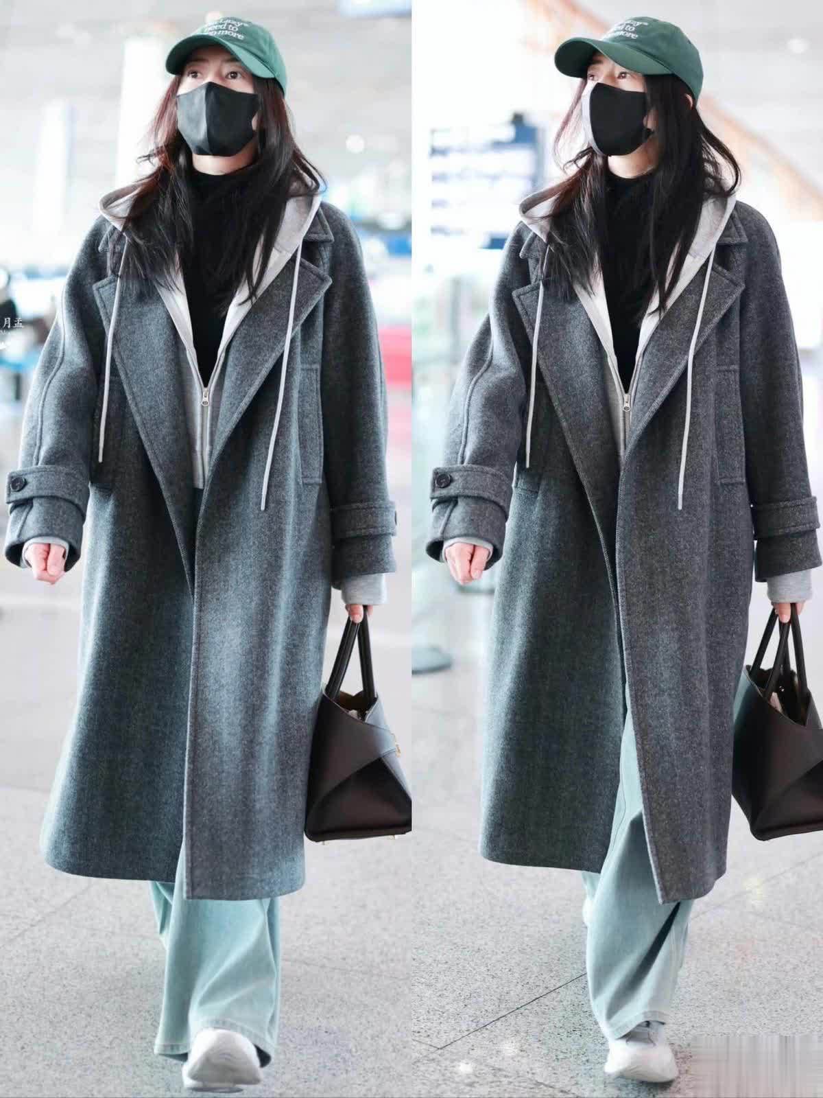 高圆圆选择用浅灰色的卫衣叠穿深灰色的大衣,虽然衣服的颜色是同色系,但由于深浅不同,所以也会觉得非常有层次感,然后再把卫衣的领口敞开,露出最里面的黑色打底衫,更是加强了层次。