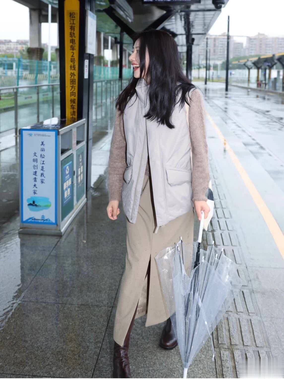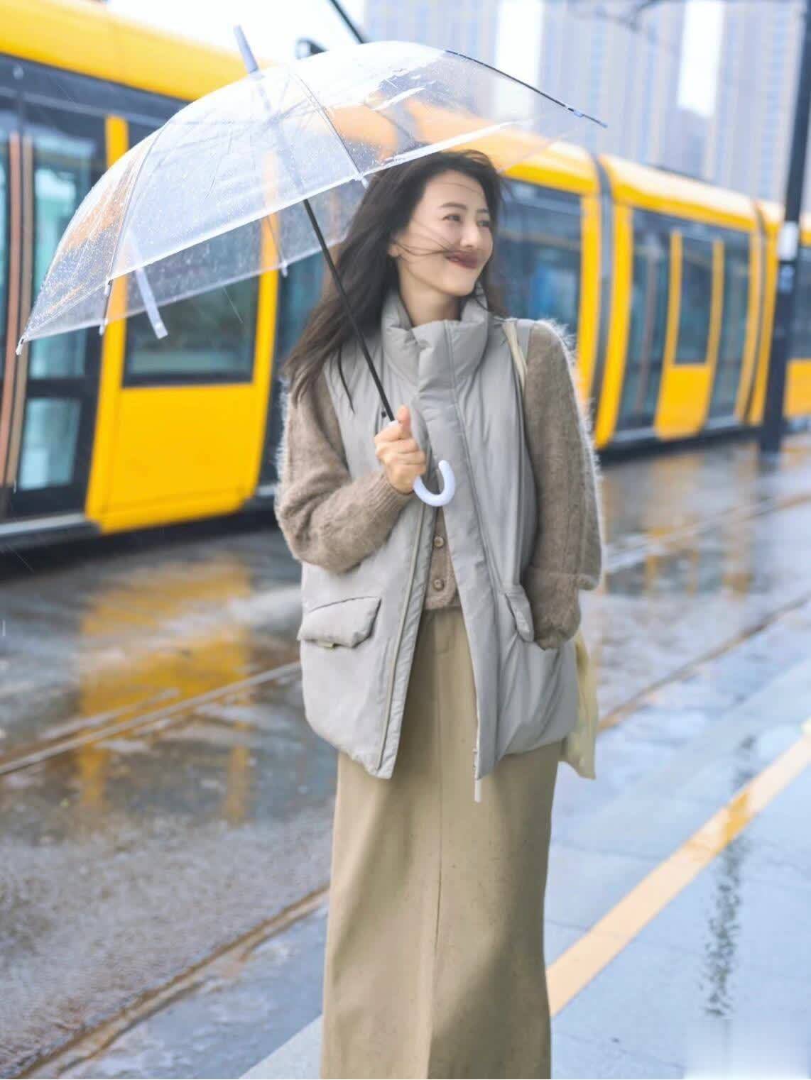用羽绒马甲叠穿卫衣会显得很休闲,但如果你换成毛衣的话,整个造型看上去则会更加的温柔,特别是这种灰色的马甲,配上咖色的毛衣,真的很有气质。