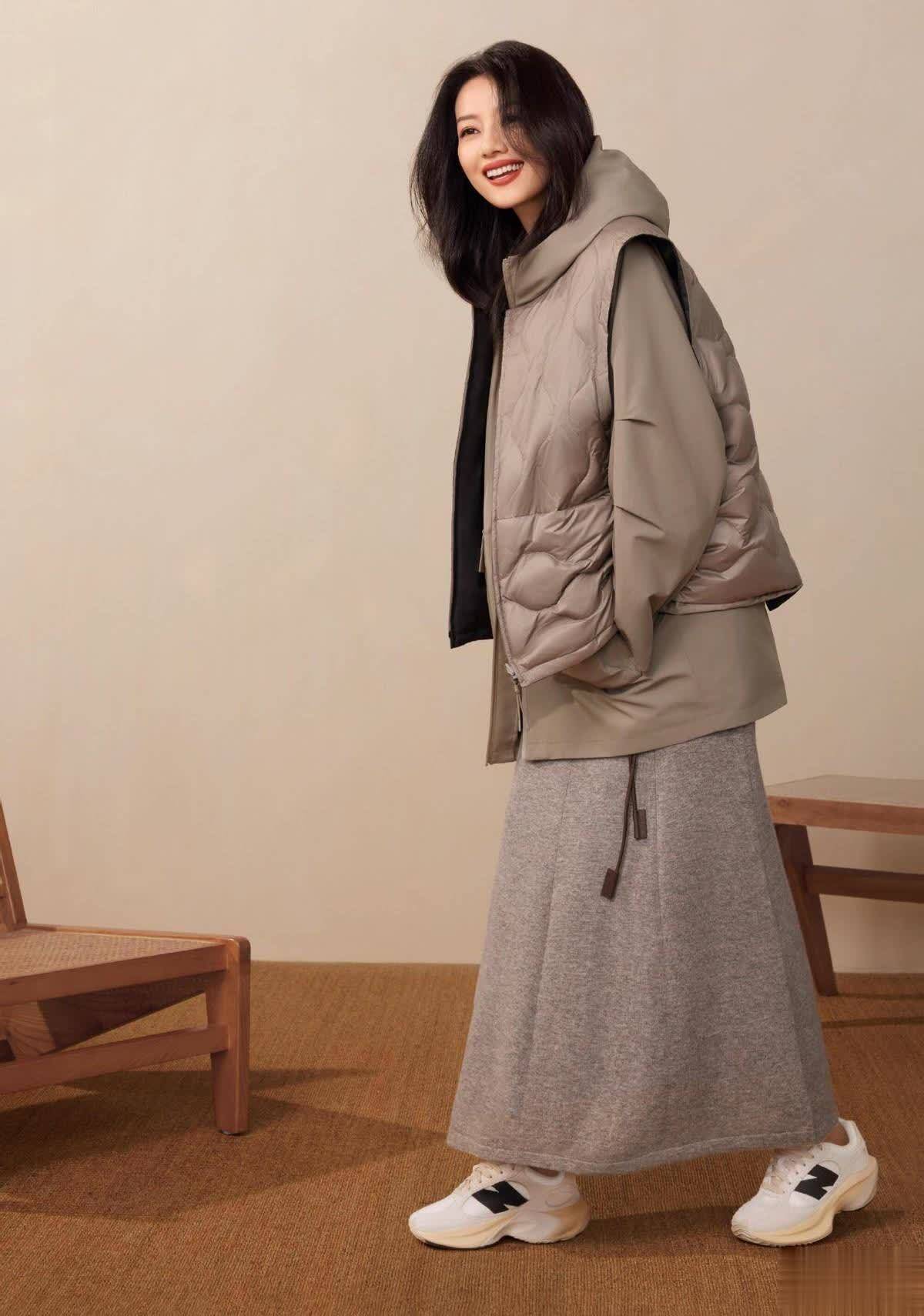这件羽绒马甲款式宽松,叠穿在卫衣的外面可以加强造型的保暖性,敞开穿马甲,也会觉得没那么的紧绷,高圆圆还在下半身配上了一条宽松的半身长裙,更是能够体现松弛感。