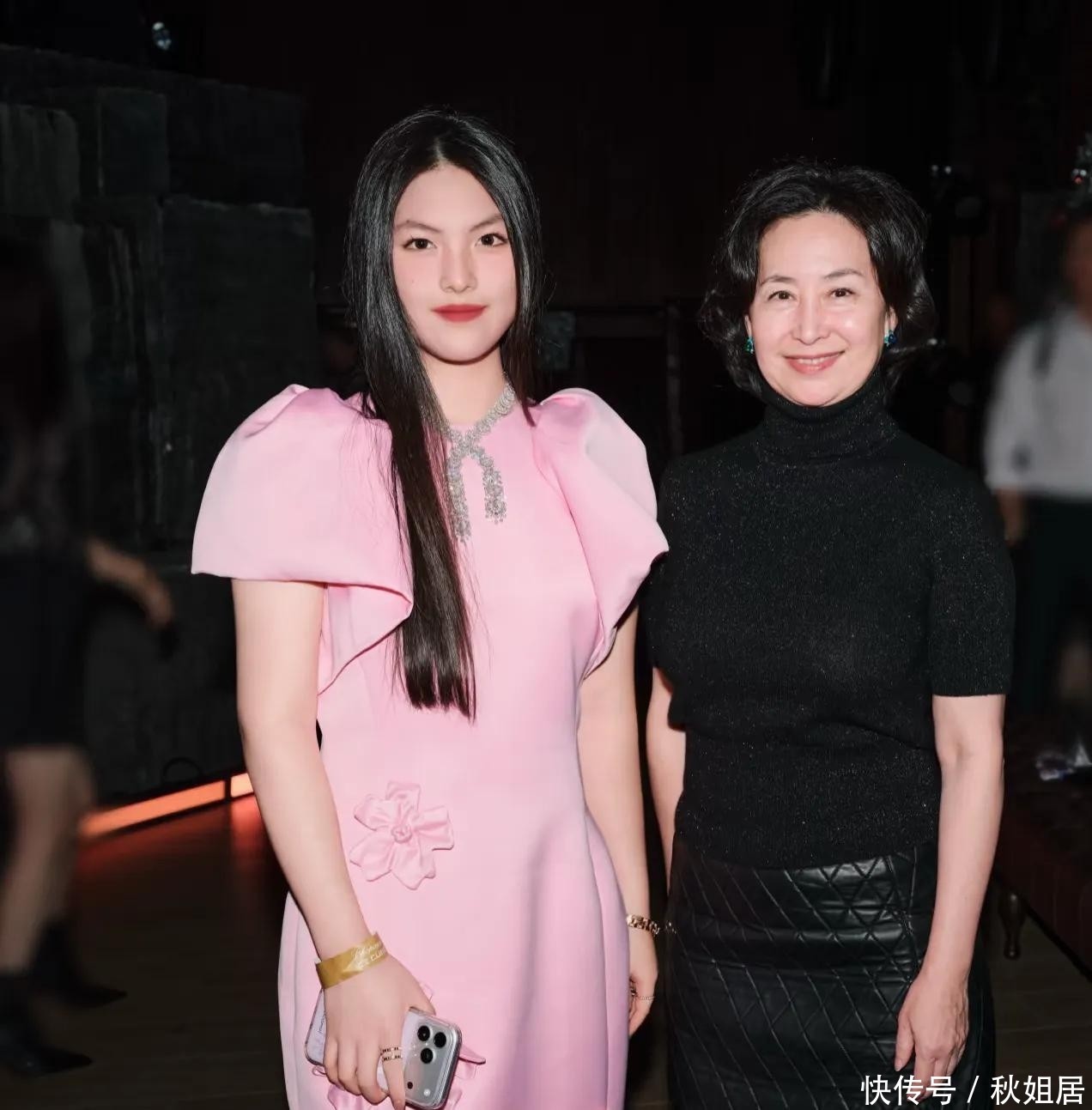 15. 另一张尤为珍贵的照片记录了王诗龄单独与何超琼的亲密合影,李湘与王岳伦并未入镜,显然是有意成全晚辈与行业领袖之间的互动。何超琼身着简约黑色套装,时尚而不失庄重,面对年轻后辈时笑容温婉,既有威严又不失亲切感。
