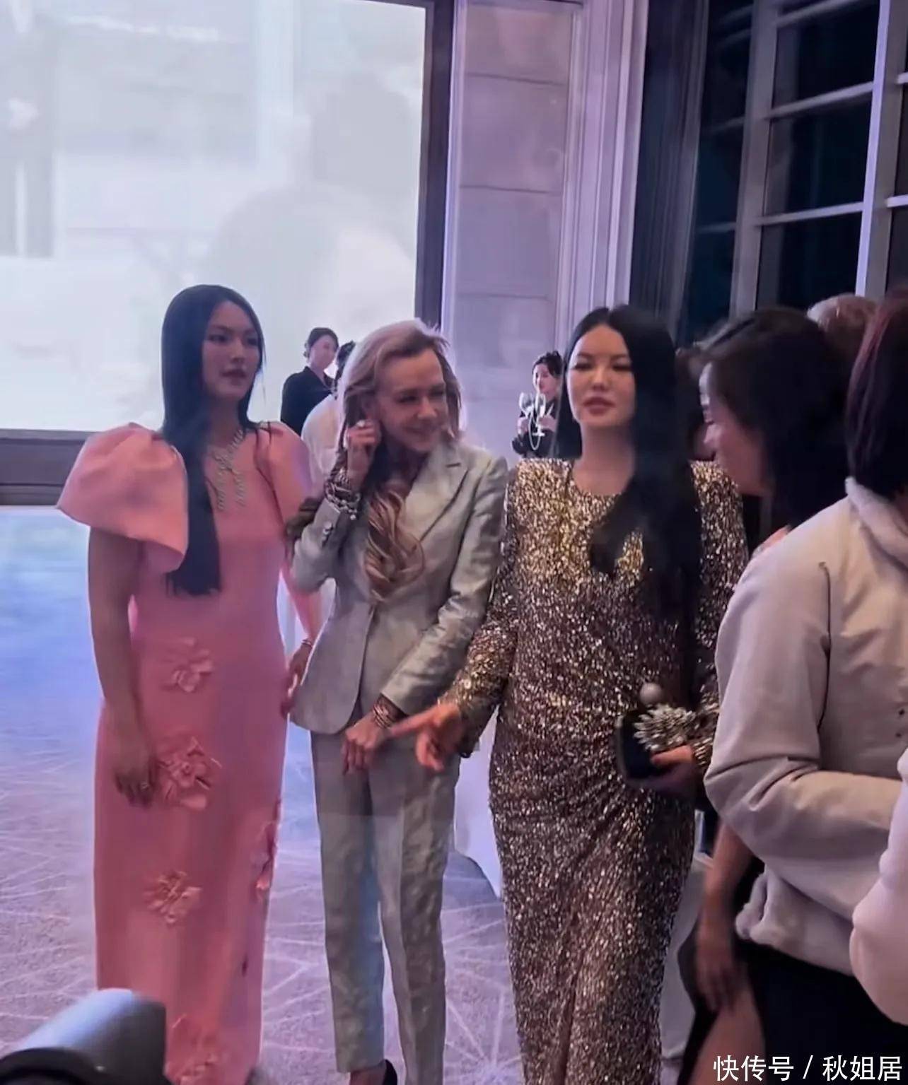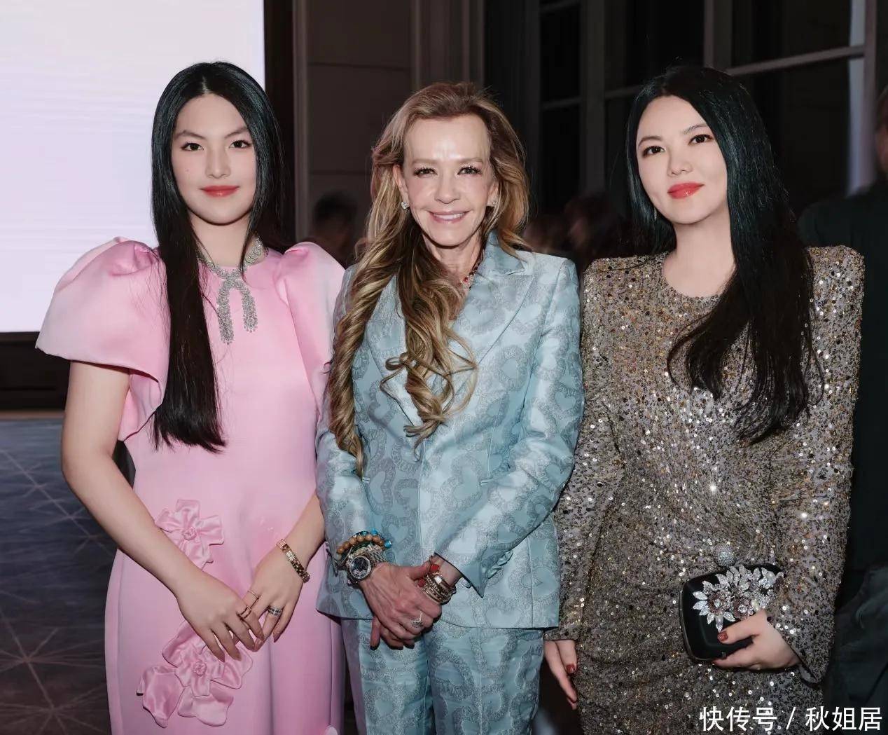 14. 李湘发布的合照中不乏重量级人物。首张合影即为王诗龄与瑞士顶级腕表品牌萧邦(Chopard)联合总裁卡罗琳·舍费尔同框画面。这位在全球时尚与影视盛典中始终占据中心位置的传奇女性,此次仍以强大影响力成为合影中的视觉重心。
